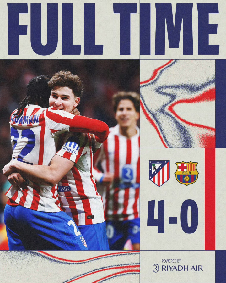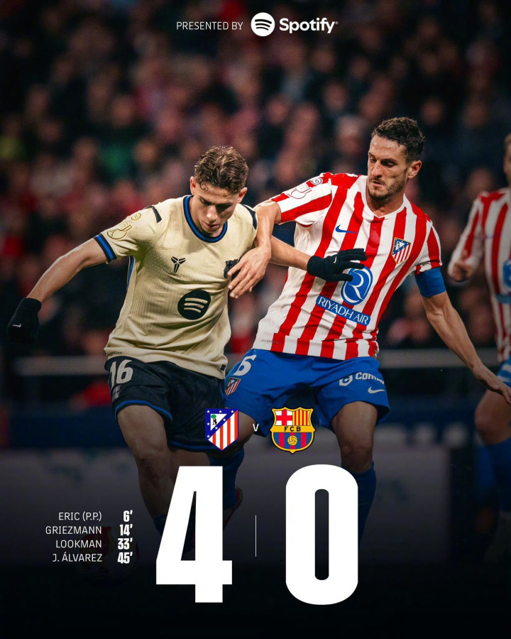 北京时间2月13日04:00,西班牙国王杯 半决赛,马德里竞技对阵巴塞罗那。上半场开场不久,埃里克-加西亚回传,霍安-加西亚将球停进自家球门,随后,巴萨后防线形同虚设,格列兹曼、卢克曼,阿尔瓦雷斯相继进球。下半场,埃里克-加西亚放倒单刀机会的巴埃纳,裁判出示红牌将其罚下。最终比分马竞 4-0 巴萨。
